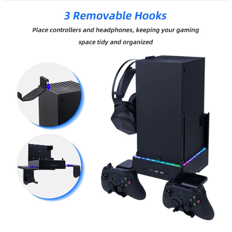 -This wall-mounted cooling stand with controller/headphone hooks is specially design for Xbox Series X, making good use of wall space for storage.
